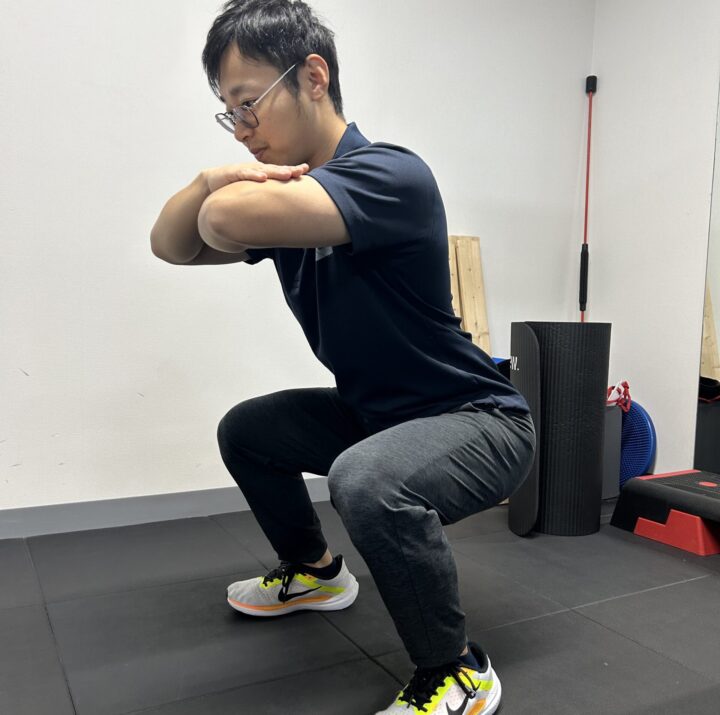 ④太ももが床と平行になるまでしゃがみ、1秒止まる。