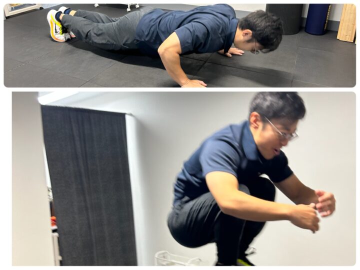 ④できる人はプッシュアップ(腕立て伏せ)を一回行う。(強度高い場合は無理せず省略してください)